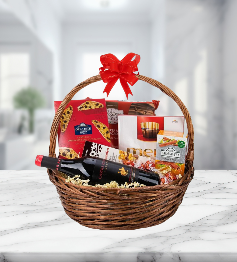 Подаръчна кошница с Червено вино Castra Rubra и шоколадов кейк, код 924