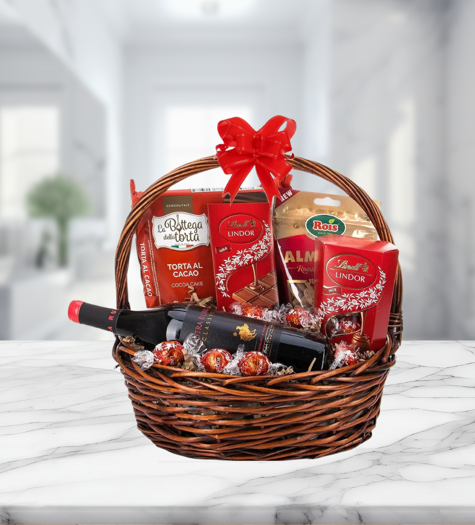Подаръчна кошница с Червено вино Castra Rubra Merlot&Malbec и Lindor sweets, код 923